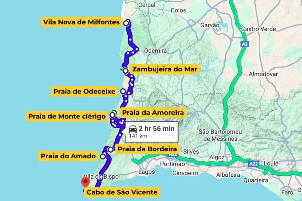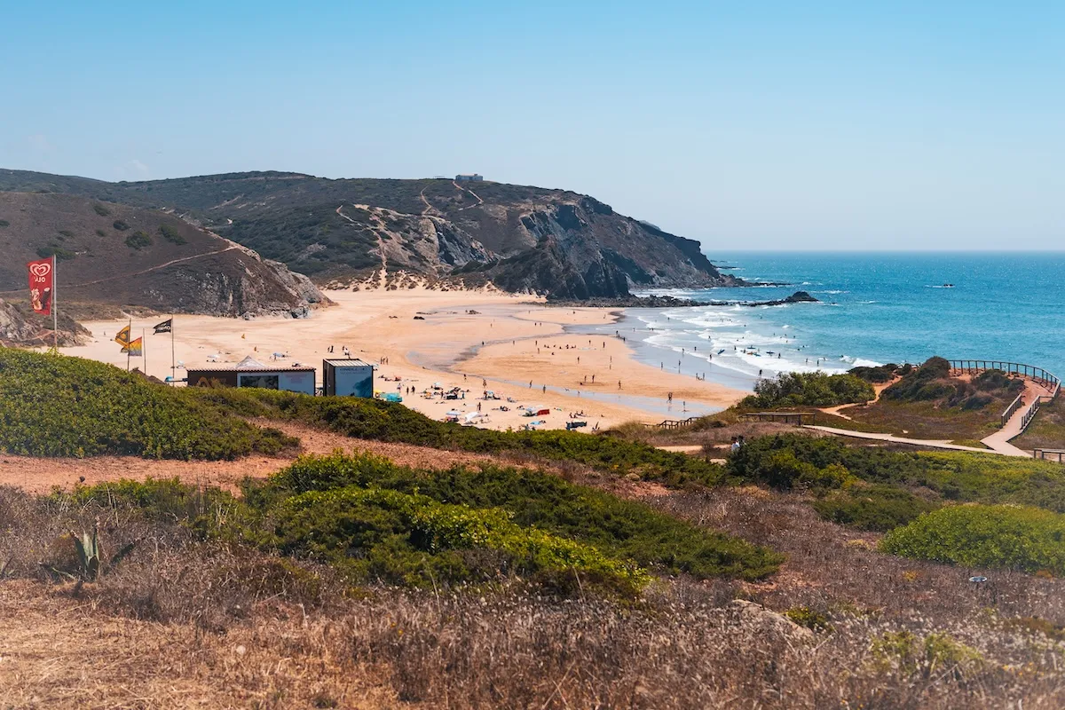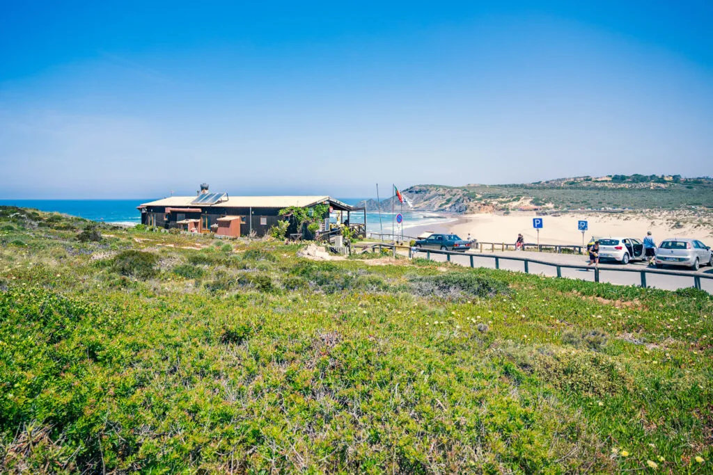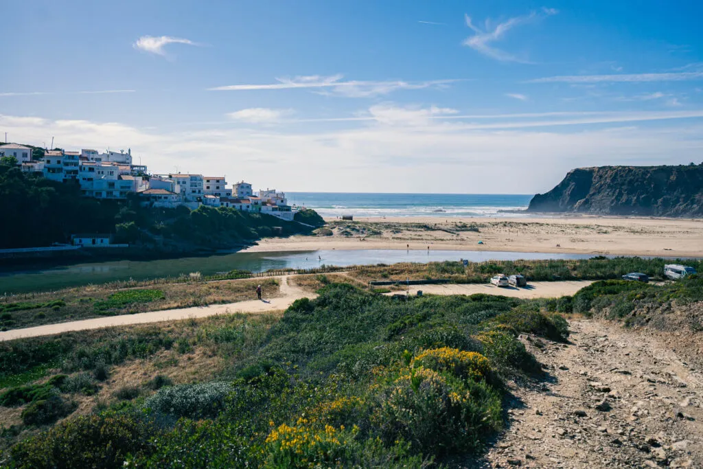 Na pláž potom dojedete autem. Pláž na druhé straně od útesů odděluje řeka. Pokud je hladina při odlivu nízká, a vy budete mít čas a chuť, doporučujeme vyjít nahoru na útesy nad pláží – po modrozeleně značené trase Rybářské stezky Rota Vicentina.