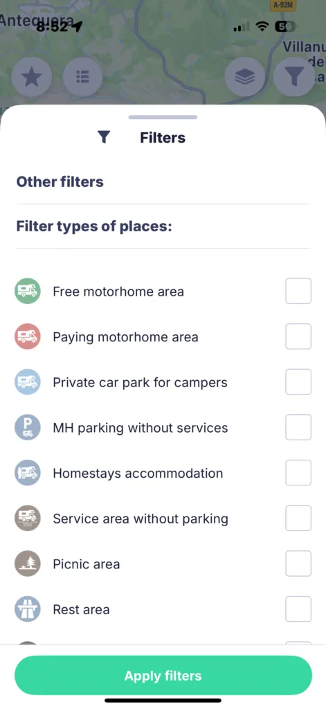 - filtrování podle typu místa (parkování, stellplatz, kemp, výlevka, voda…),